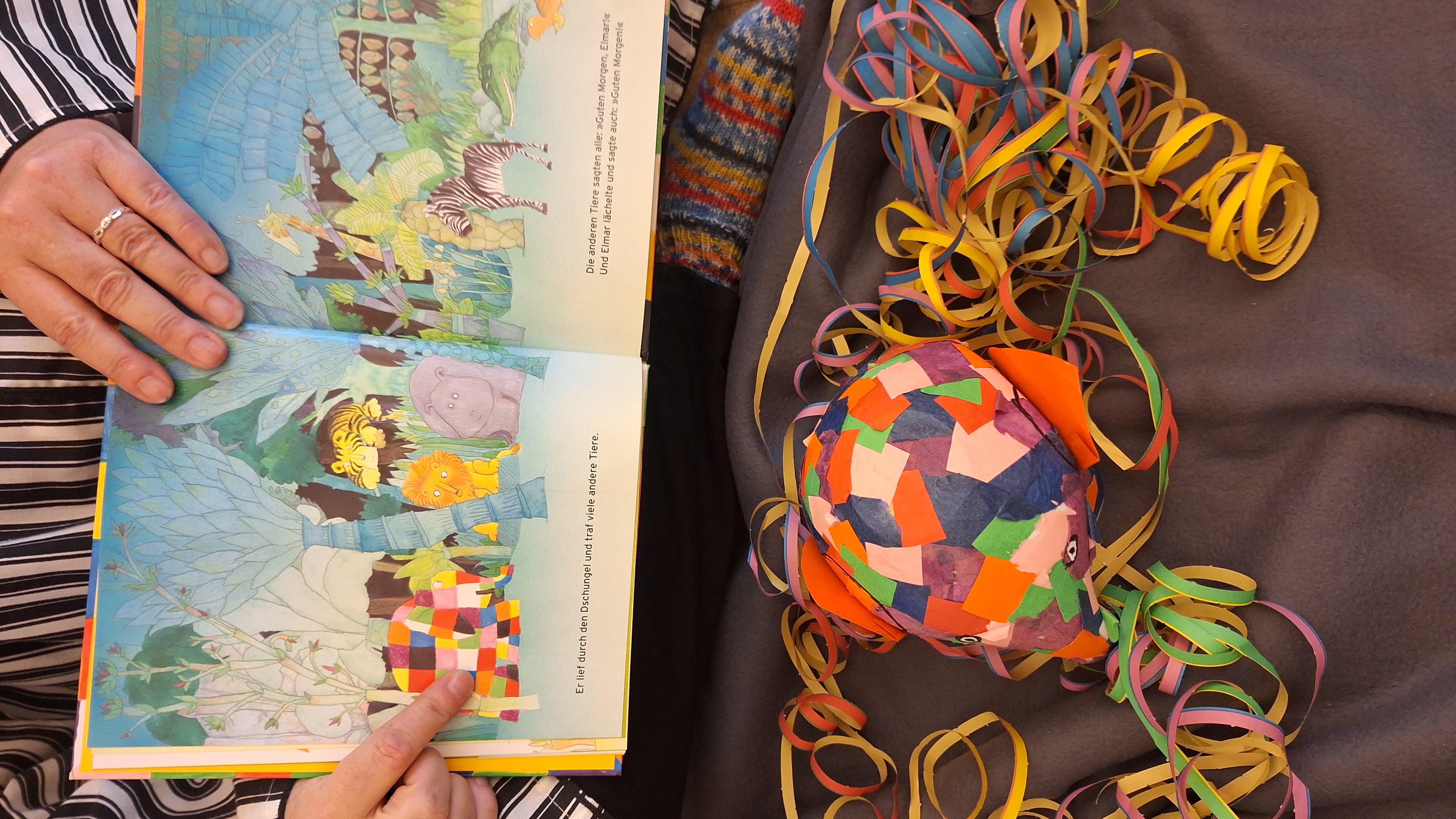 Passend zum Fasching und zu unserem Buch „Elmar “ tauchten die Kinder in eine farbenfrohe Welt ein. Mit fantasievollen Kostümen, lustigen Spielen und viel Bewegung feierten wir die Vielfalt – so einzigartig und kunterbunt wie Elmar selbst.